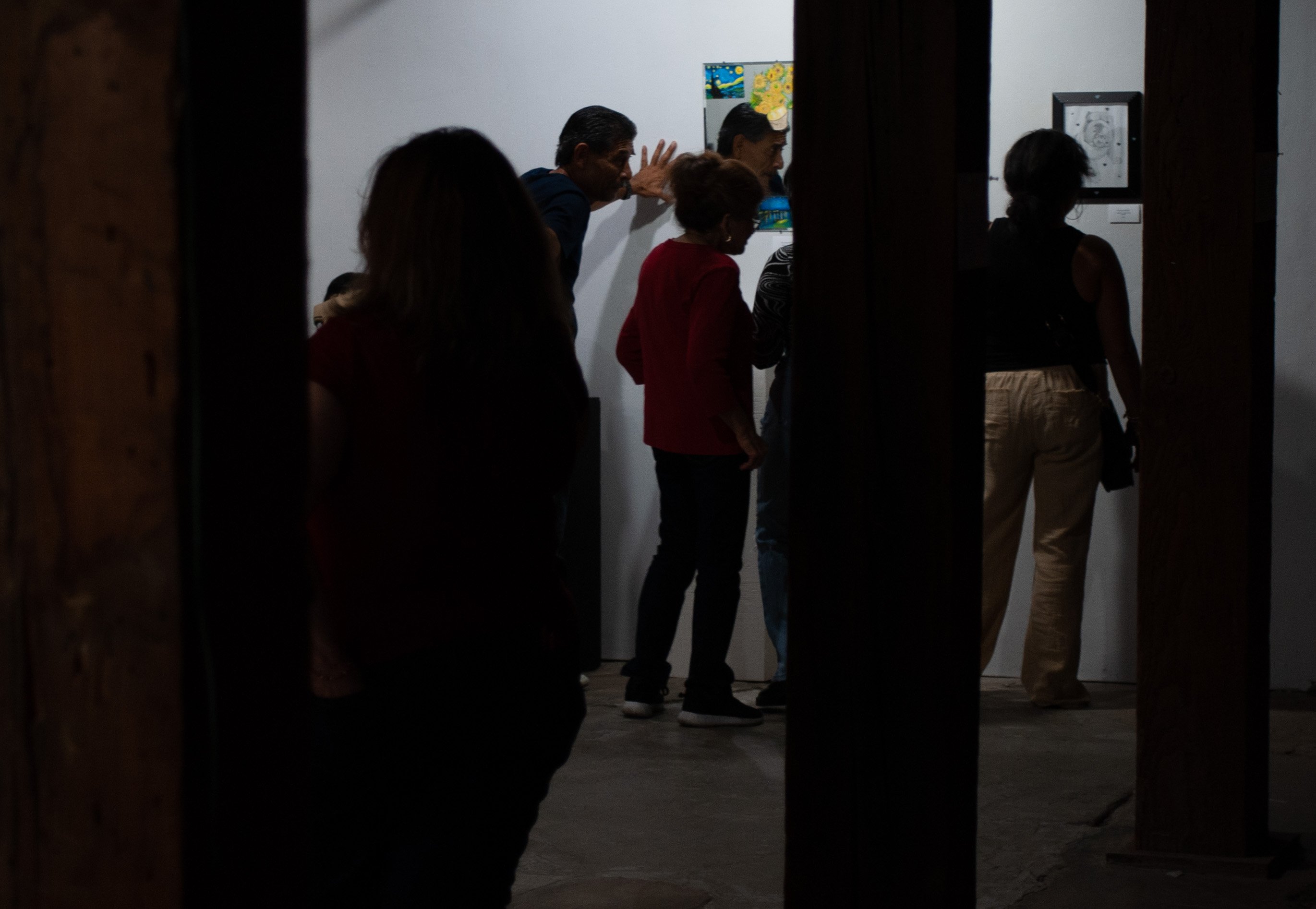 Sometimes areas of bright color can be sharply emphasized by setting them off against larger areas of white or black. In this photo you can see the silhouette of a crowd against a sharp white background of a gallery.
