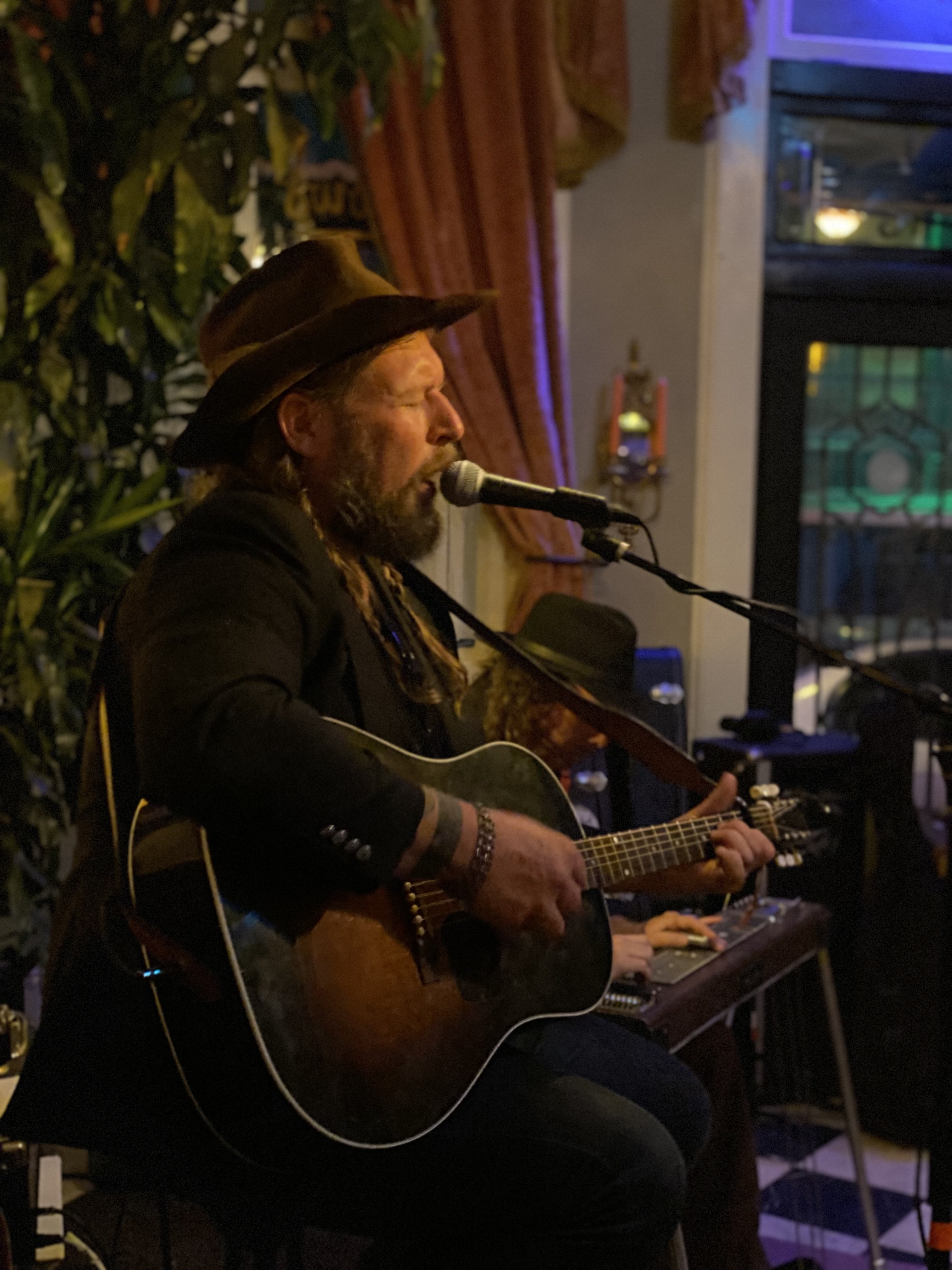 A scene does not need to contain bright raw colors in order to make a good picture. In fact, the more subtle sophisticated hues often produce the most pleasing results. An interesting example is featured with this American guitarist singing inside of a café.